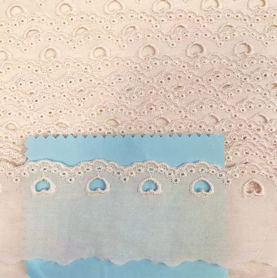 Ақ гүлді мақта таза мақтадан жасалған, ол таза мақтадан жасалған, ол толқынды шеттері бар үш өлшемді кішкентай гүлдермен, оны жұмсақ, дем беретін және табиғи ретро. Ол балалар киімін, әйелдер киімін, тұрмыстық заттарды, тұрмыстық заттарды және т.б. безендіруге жарамды. Бұл экологиялық таза және теріге ыңғайлы, жууға болады және ені бірнеше нұсқаларын ұсынады. Реттеуге қолдау көрсетіледі.